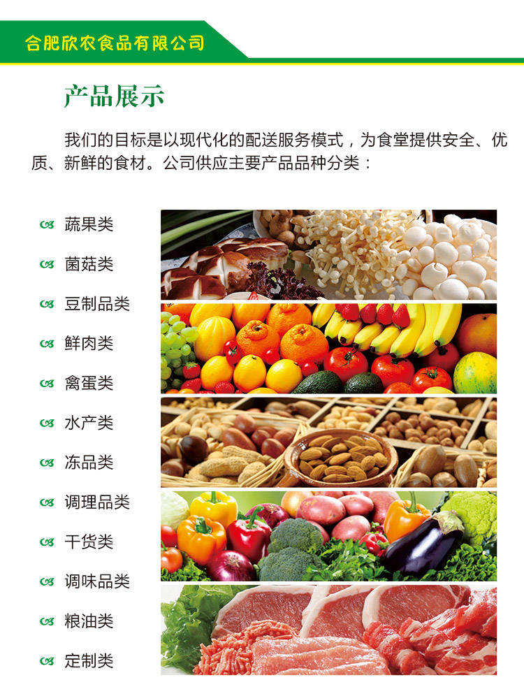我們深知食品安全必須從源頭控制開始把控,公司與合肥市周邊多家大型種、養(yǎng)殖基地建立長期合作關(guān)系,在實現(xiàn)采購源頭化的同時,我們對基地產(chǎn)品的生長過程進行全程監(jiān)控;肉類及冷凍制品、干調(diào)糧油等與有名廠商直接合作,在確認產(chǎn)品質(zhì)量的同時也降低了采購成本。